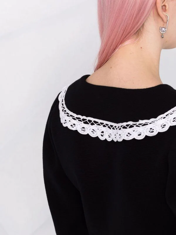 Details aus Spitze, Bubikragen, Knopfverschluss vorne, Puffärmel in Dreiviertellänge, Cropped-Design. Material: Baumwolle.