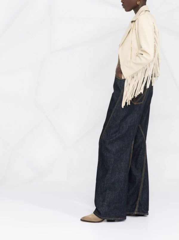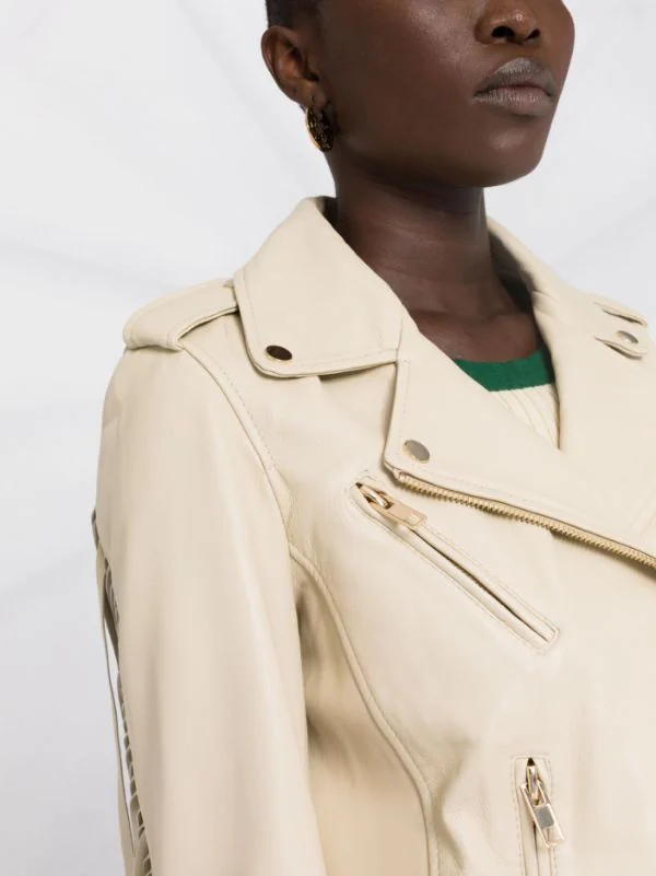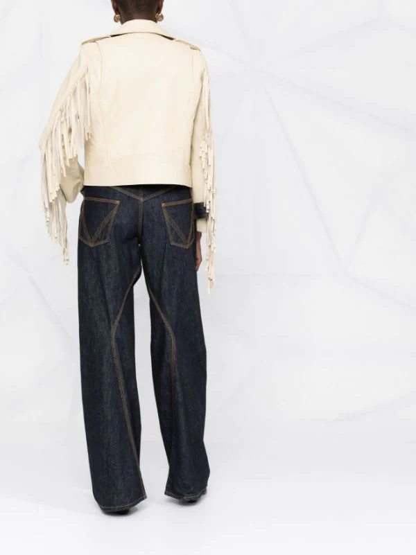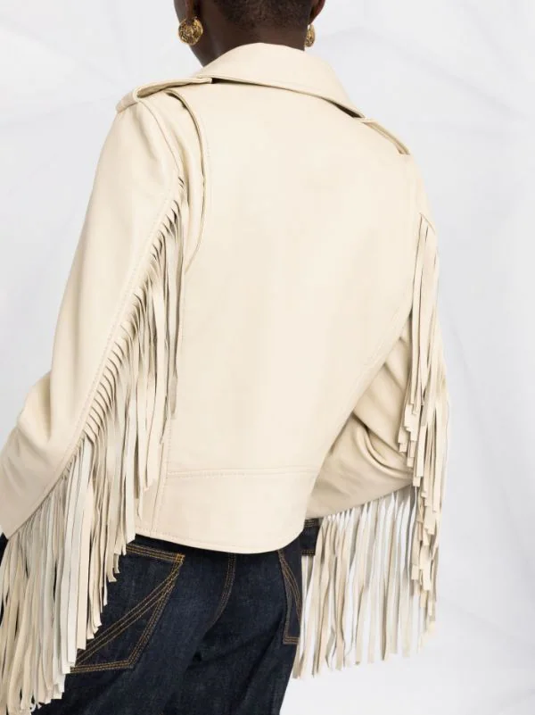 Fransen-Detail, Schulterklappen, Kragen mit Druckknopf, doppelreihiger Reißverschluss vorne, Reißverschlusstaschen vorne.