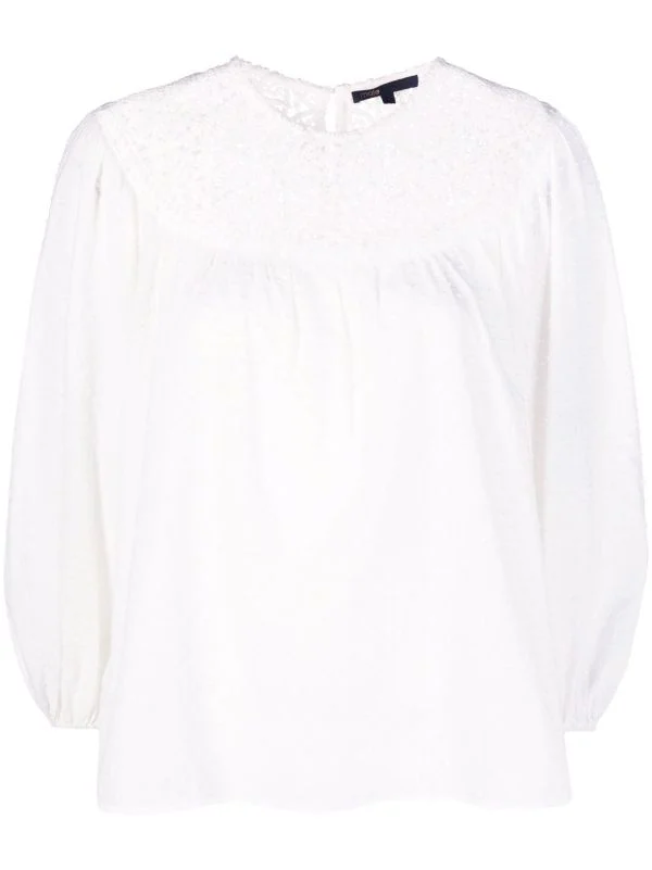 Runder Ausschnitt, Knopfverschluss hinten, Rüschen, abgerundeter Saum, lange Puffärmel, elastische Bündchen. Farbe: Weiß. Material: Baumwolle.