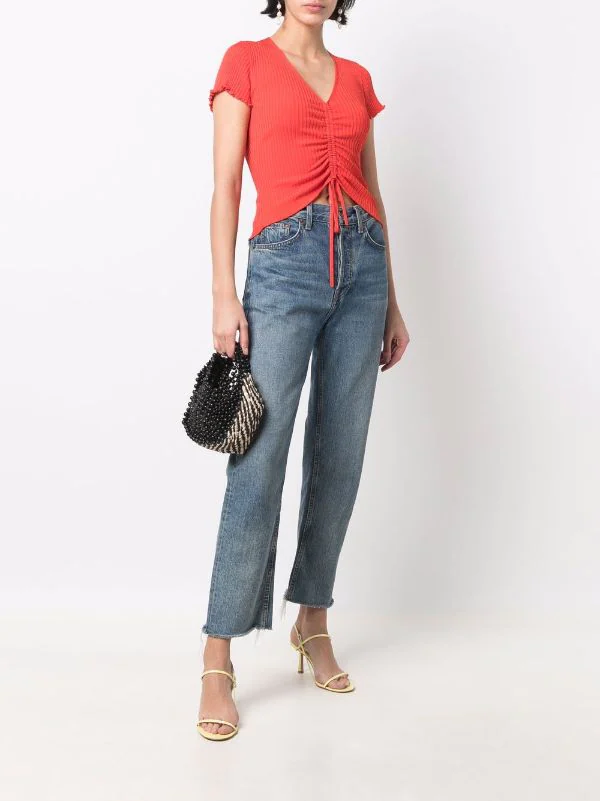 Gerippter Strick, Schleifenverschluss vorne, Rüschen, V-Ausschnitt, kurze Ärmel, asymmetrischer Saum. Farbe: Orange.